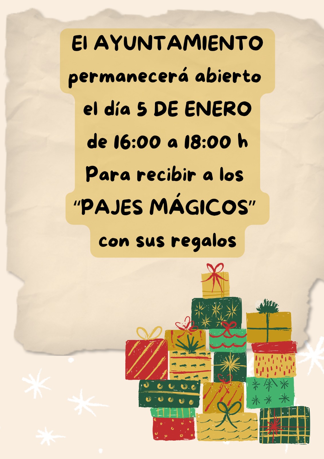 RECOGIDA REGALOS PAJES REALES MÁGICOS. 05 enero 2026 Se informa que: Ponemos a vuestra disposición el Ayuntamiento en horario de 16:00 a 18:00 para la recogida de regalos de los pajes reales mágicos.