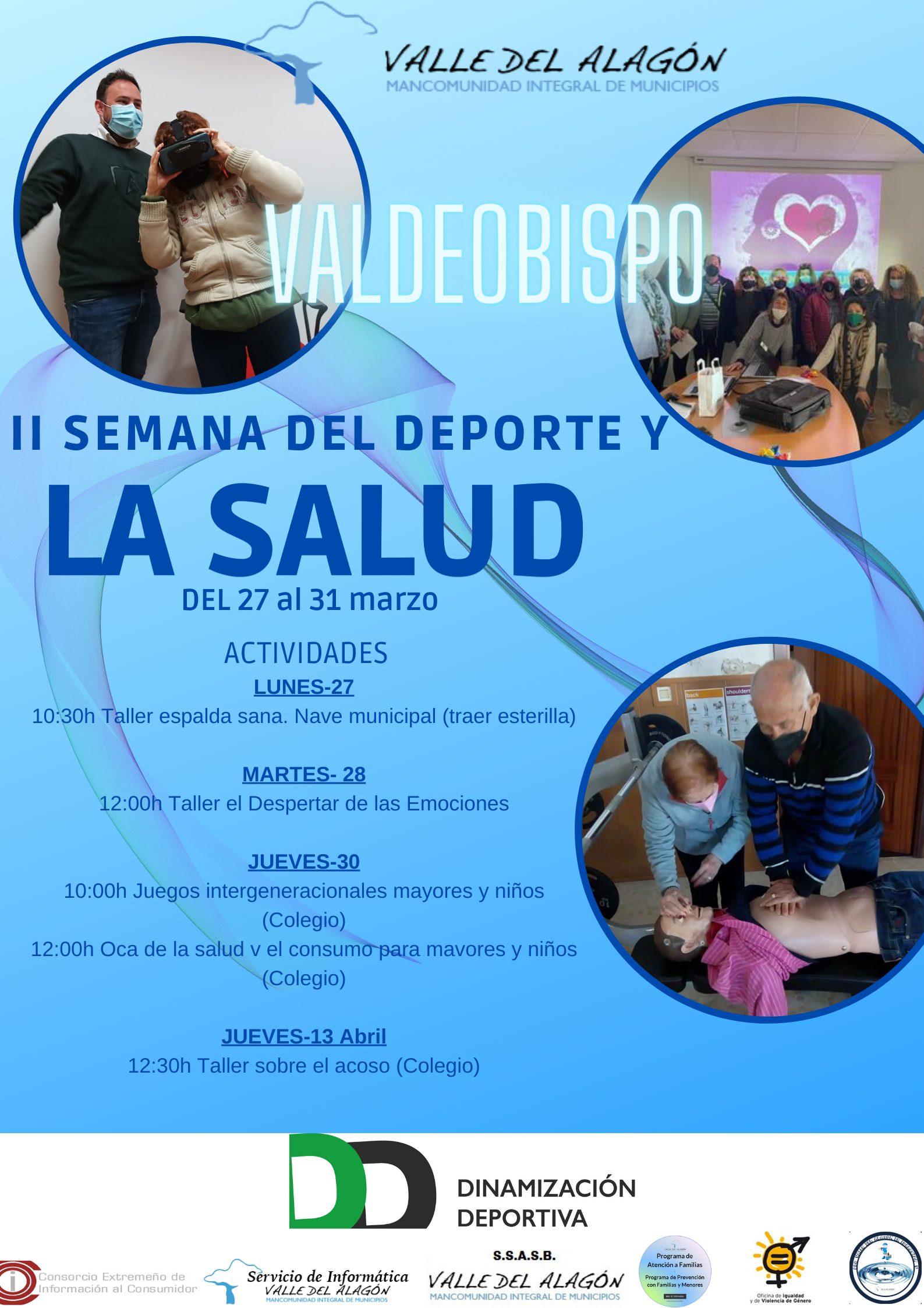 II SEMANA CULTURAL DE LA SALUD Y EL DEPORTE 22 marzo 2023 Con motivo de la II Semana Cultural de la Salud y el Deporte se van a llevar a cabo una serie de actividades durante la semana del 27 al 31 de marzo. ¡¡ESTÁIS TODOS INVITADOS!!