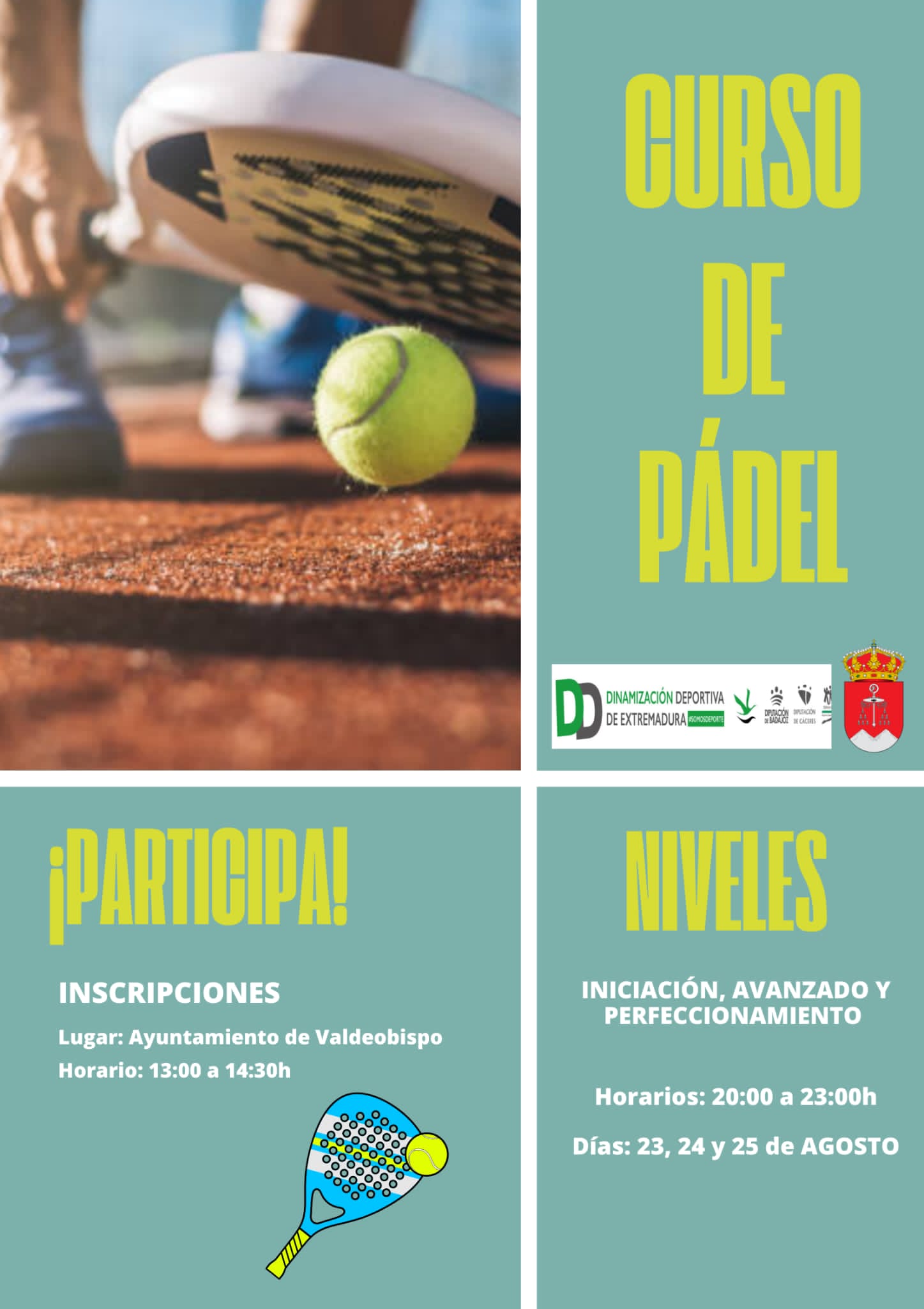 Se informa a tod@s l@s vecin@s que el Ayuntamiento de Valdeobispo ofrecerá un curso de pádel los días 23, 24 y 25 de agosto, de 20.00 a 23.00 horas.
