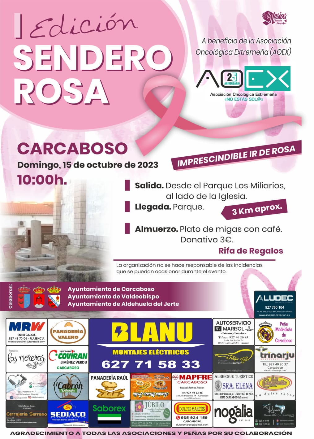 Se informa a tod@s l@s vecin@s que el próximo domingo, 15 de octubre, tendrá lugar la I Edición de Sendero Rosa, una marcha a beneficio de la Asociación Oncológica Extremeña (AOEX).