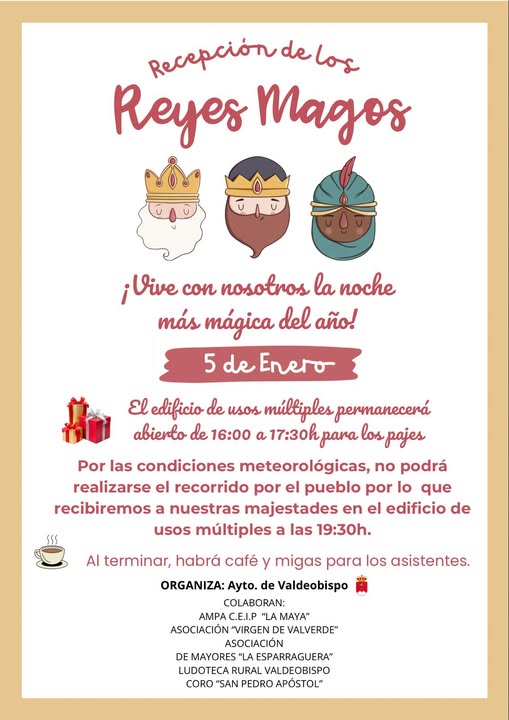 Por las condiciones meteorológicas, no podrá realizarse el recorrido previsto por el pueblo, por lo que recibiremos a nuestras majestades los Reyes Magos en el edificio de usos múltiples a las 19:30h, mañana (domingo).